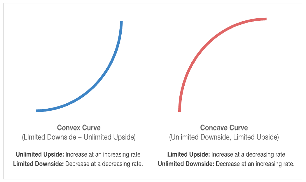 On the upside, convexity curves upwards where gains increase at an increasing rate, and concavity curves downwards where gains increase at a decreasing rate.