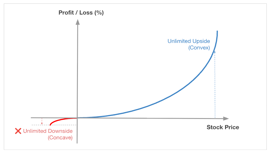Convexity has positive asymmetry: limited downside and unlimited upside, which is highly desired. Conversely, concavity has negative asymmetry, unlimited downside, and limited upside, which is not desired. We always prefer to play and structure our games to be as positively asymmetric over time, and eliminate unlimited downside.