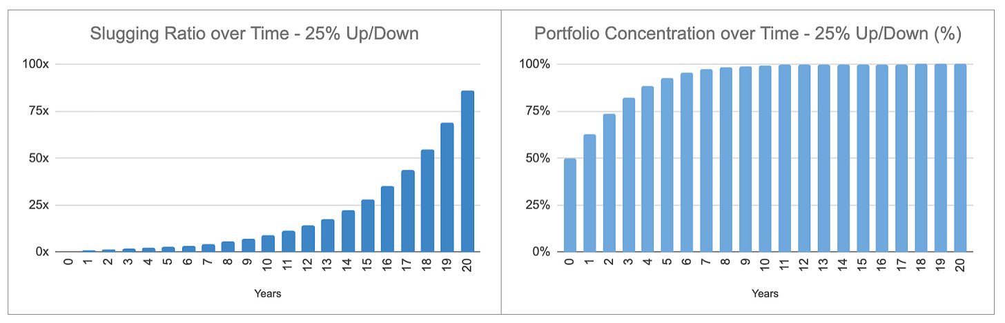 3 | Winners become increasingly significant as you hit it out of the park, as portfolio concentration grows over time. The gains from the multibagger winners will keep growing, increasingly offsetting the losers’ combined losses many times over. The losers don’t matter, the winners do.