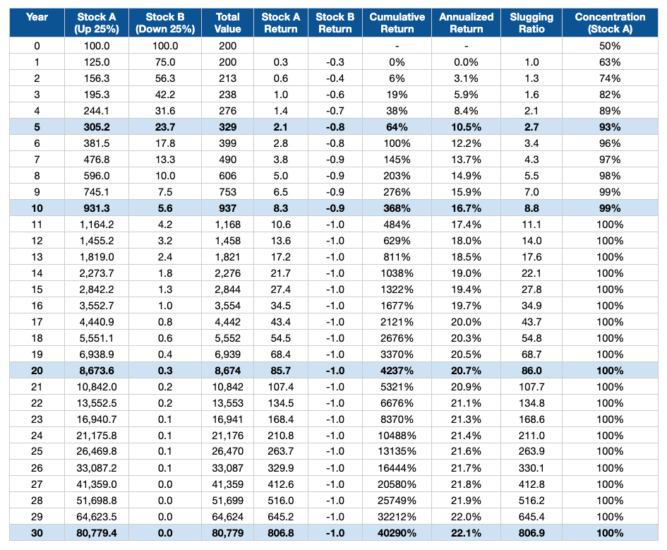 While we acknowledge that the assumptions are highly simplistic: (1) a constant 50% batting average, (2) an equal-weighted two-stock portfolio, and (3) both stocks rising and declining at the same rate, the following lessons are instructive.