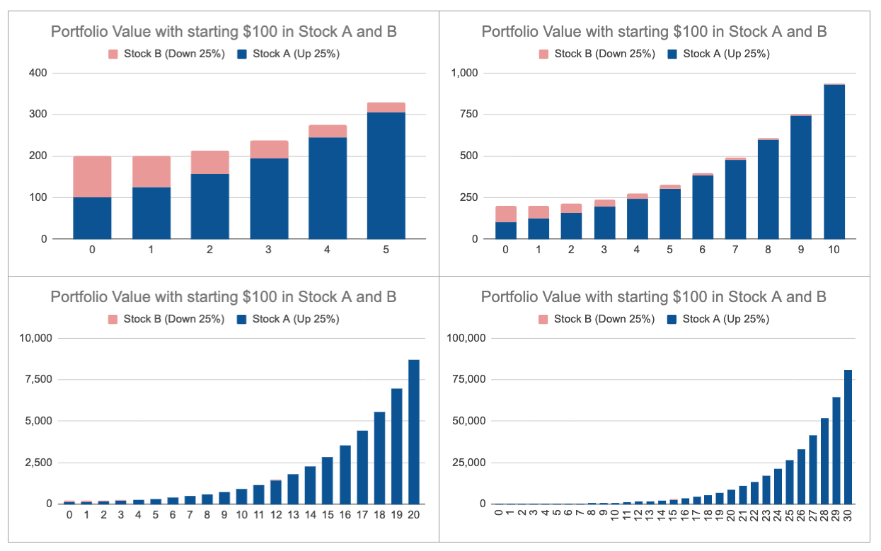 Let’s start with $100 equally invested in Stock A and B. The price of Stock A keeps rising 25% every year, and Stock B keeps declining 25% every year.
