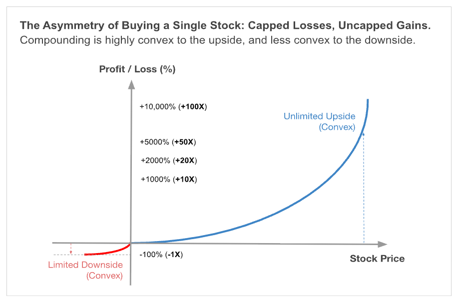 We first wrote about the asymmetry of stock investing, where it is like being long optionality, like long a call option. Asymmetry is the holy grail in finance. The initial return profile of buying a stock is symmetrical. If a stock goes up 25%, you make 25%, and vice versa, if a stock goes down 25%, you lose 25%.
