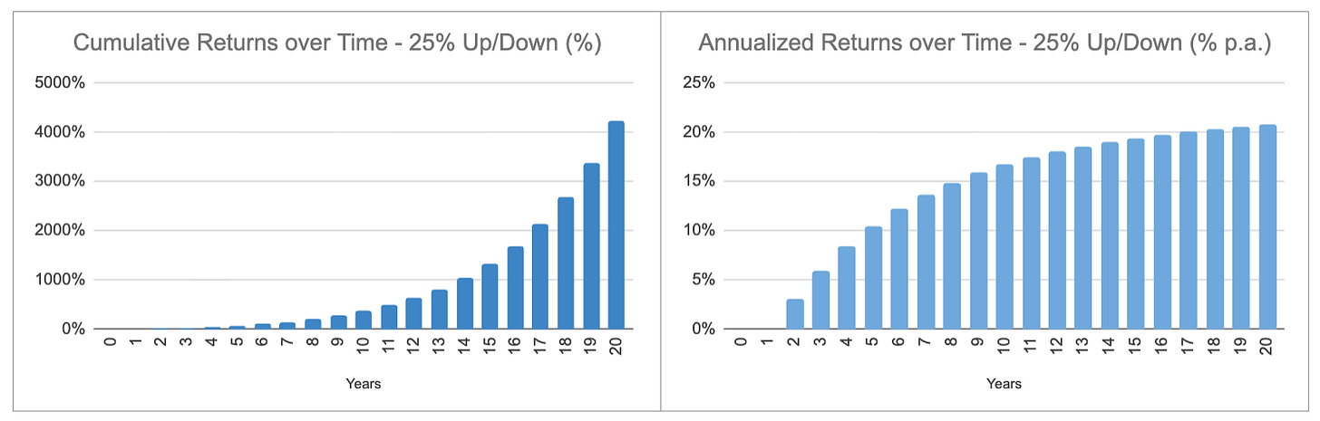 Buying a stock looks symmetrical initially. Up 25%, you make 25%. Down 25%, you lose 25%. But hold long enough, and something remarkable happens: the symmetry breaks. Your losses can only compound toward zero. Your gains can compound toward infinity. This is convexity—the math of investing, rigged in your favor.